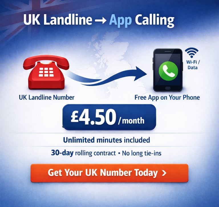 UK landline bundle for mobile app offering inbound and outbound calls for nine pounds ninety-nine per month.UK landline bundle for mobile app offering inbound and outbound calls for nine pounds ninety-nine per month.